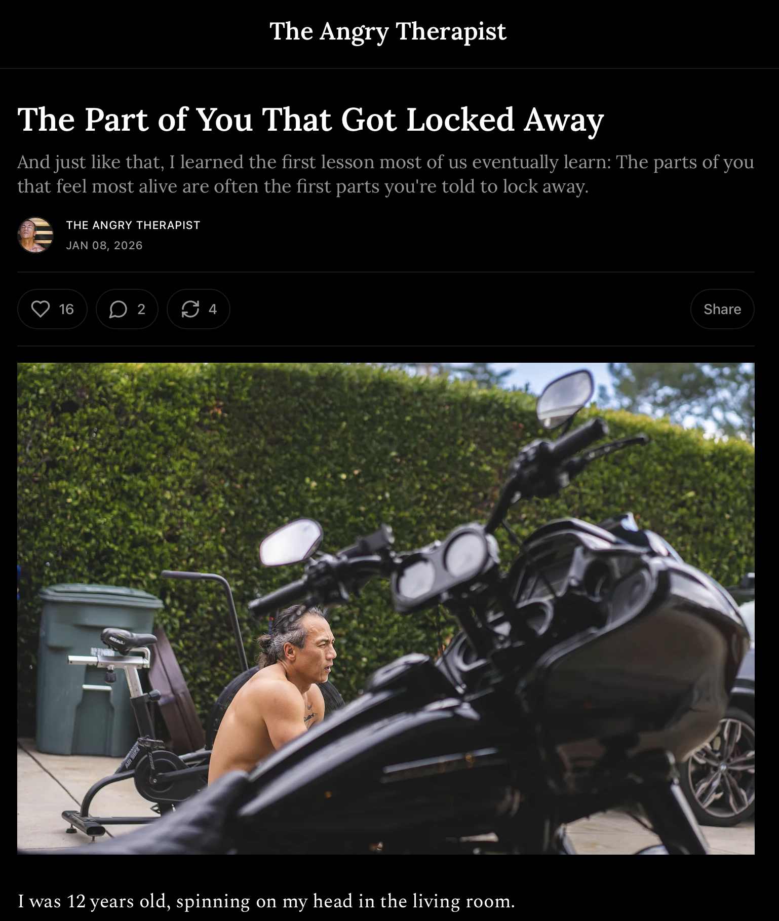 Speaking of childhood memories… The Angry Therapist wrote this week about how “the parts of you that feel most alive are often the first parts you’re told to lock away.”